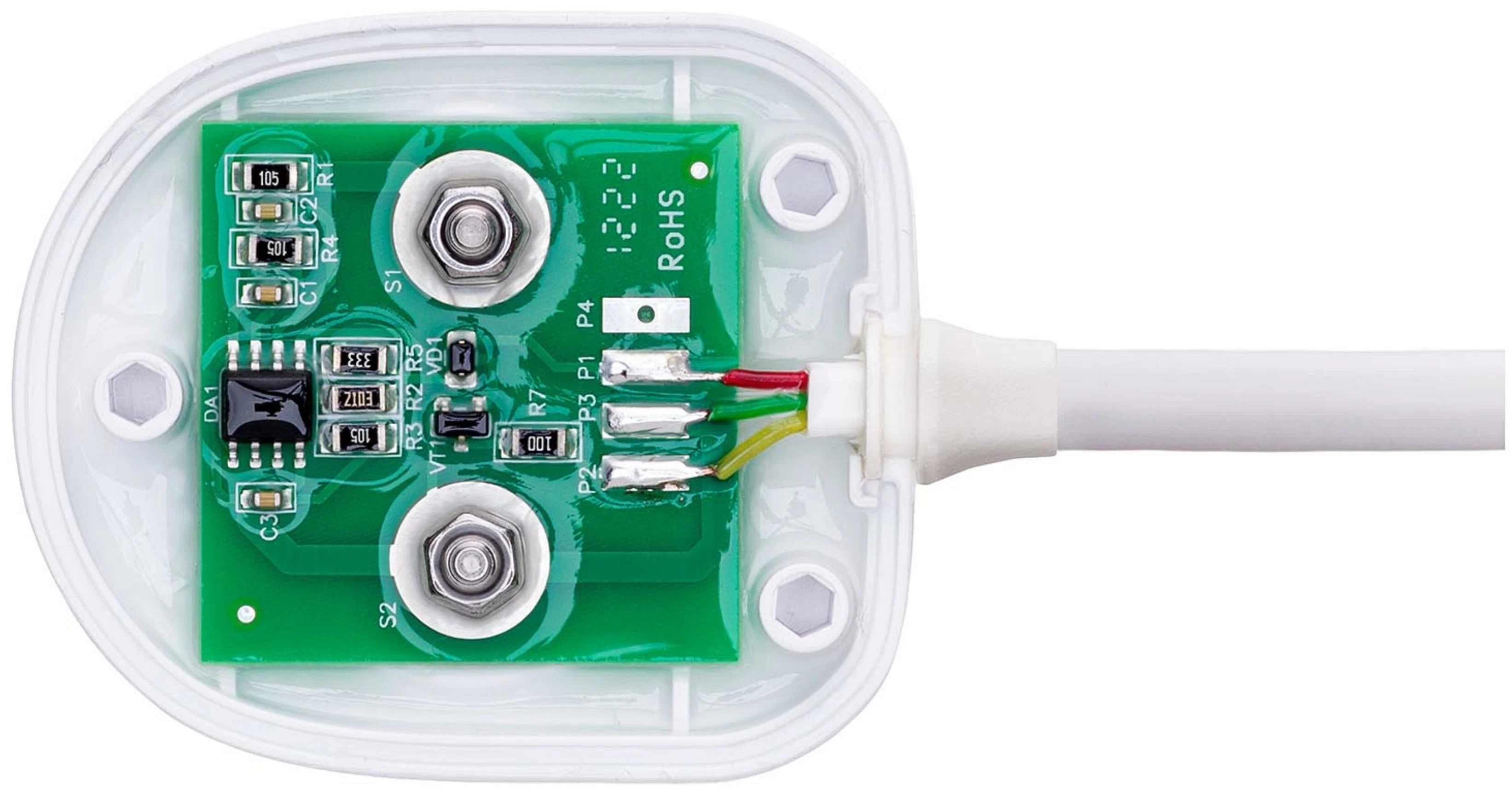 Основной функционал датчика — обнаружение протечки воды и направление аварийного сигнала к модулю управления. Датчик подключен к безопасному источнику питания и абсолютно безопасен при прикосновении к пластинам-контактам.