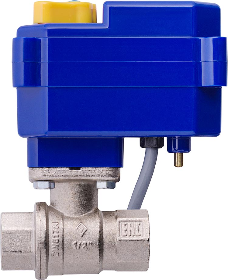 Шаровой полнопроходный кран предназначен для блокировки подачи воды. Изготовлен из горячекованной латуни. Оснащен металлическими шестернями. Расположенные на нижней части корпуса электропривода рычаг и кнопка добавляют к имеющемуся функционалу возможность ручного управления. Корпус изделия изготовлен из полированного карбоната.