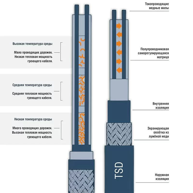 Кабель нагревательный саморегулирующийся марок TSD предназначен для обогрева трубопроводов, резервуаров, водосточных систем, кровель и для работы в составе нагревательных устройств и приборов различного назначения при рабочем напряжении до 240В переменного тока частоты 50Гц.