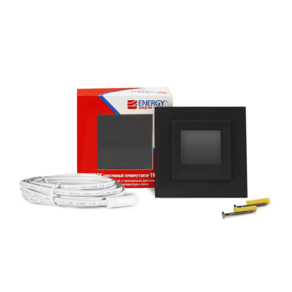 Energy TK08 - электронный программируемый терморегулятор с крупным сенсорным жидкокристаллическим дисплеем и стильным корпусом черного цвета, предназначенный для управления температурой в системах «теплый пол». В комплект входит выносной датчик температуры поверхности пола типа NTC.