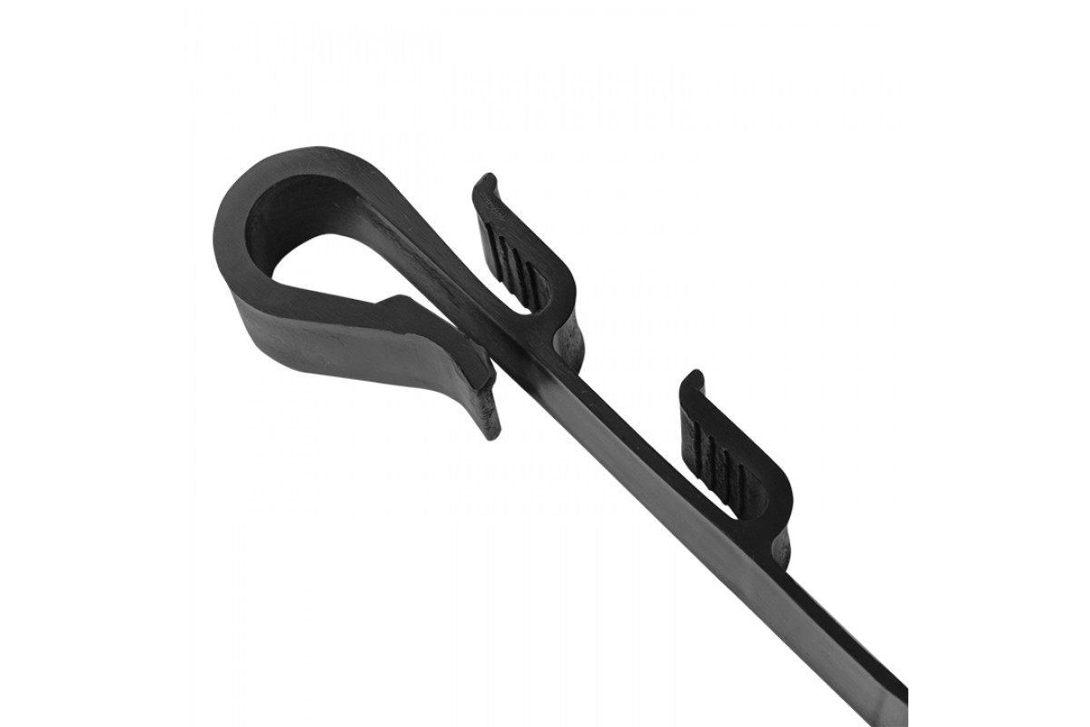 Зажим КМ/ В1-6 имеет шесть проушин, а так же крюк, который позволяет фиксировать зажим в водосточном желобе. Зажим предназначен для установки в желоба разного диаметра, однако, если диаметр желоба менее 180 мм, перед установкой необходимо провести примерку зажима и отделить лишнюю часть зажима.