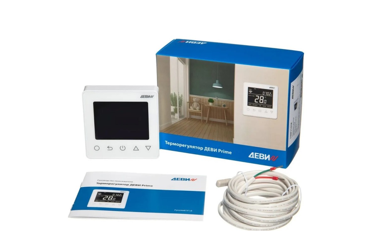 ДЕВИ Prime – это электронный программируемый терморегулятор со встроенным датчиком температуры воздуха и датчиком температуры пола на проводе с возможностью управления через Wi-Fi.