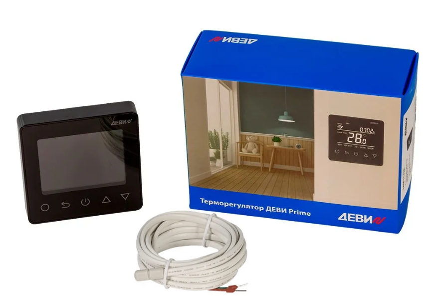 ДЕВИ Prime – это электронный программируемый терморегулятор со встроенным датчиком температуры воздуха и датчиком температуры пола на проводе с возможностью управления через Wi-Fi.