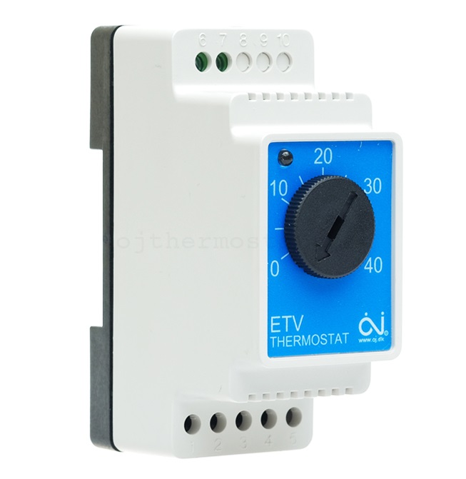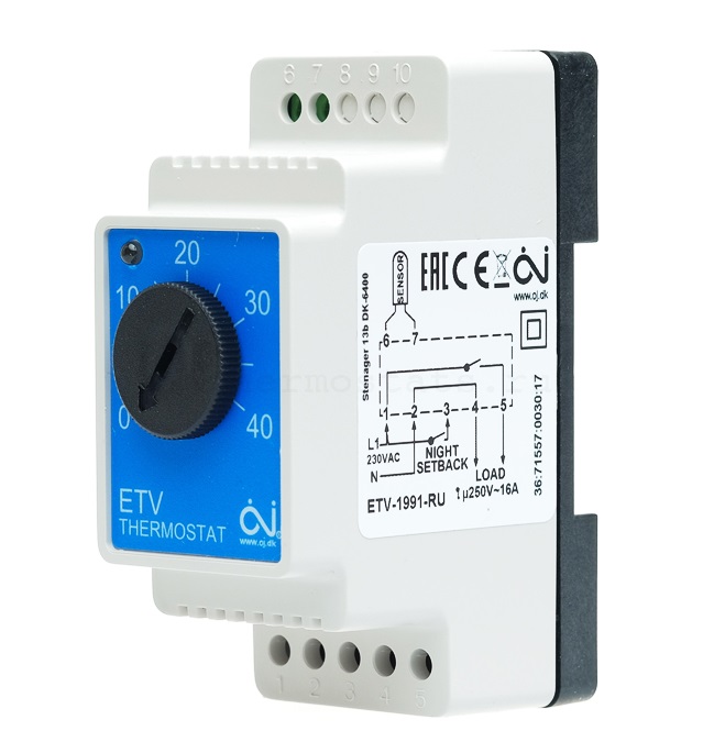 Термостат OJ Electronics ETV-1991 на DIN-рейку предназначен для управления системами электрического обогрева пола, открытых площадок, подогрева оснований холодильных камер, отопления жилых и хозяйственных помещений.